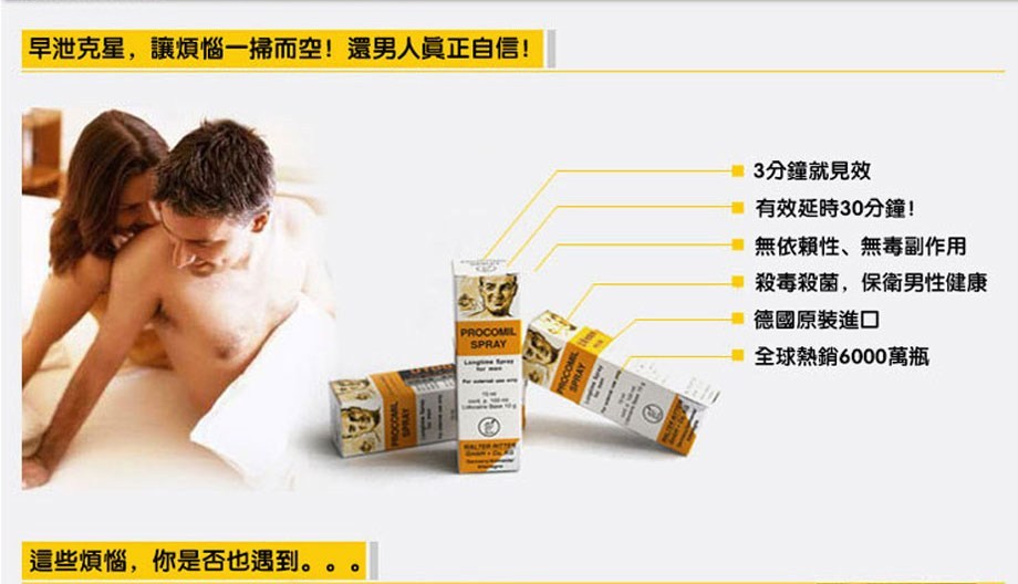 PROCOMIL SPRAY德國金剛持久液特含活性分子,3分鐘見效,有效延時30分,無依賴性無副作用,德國原裝進口,全球熱銷8000萬瓶,銷售32週年仍然是火爆如初!