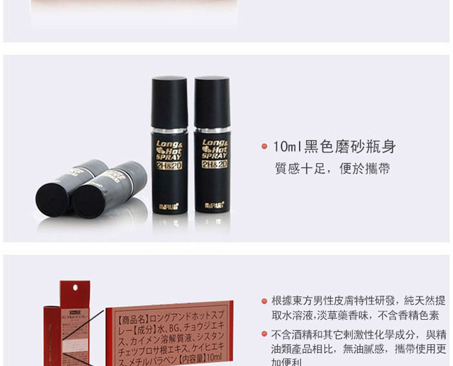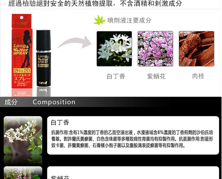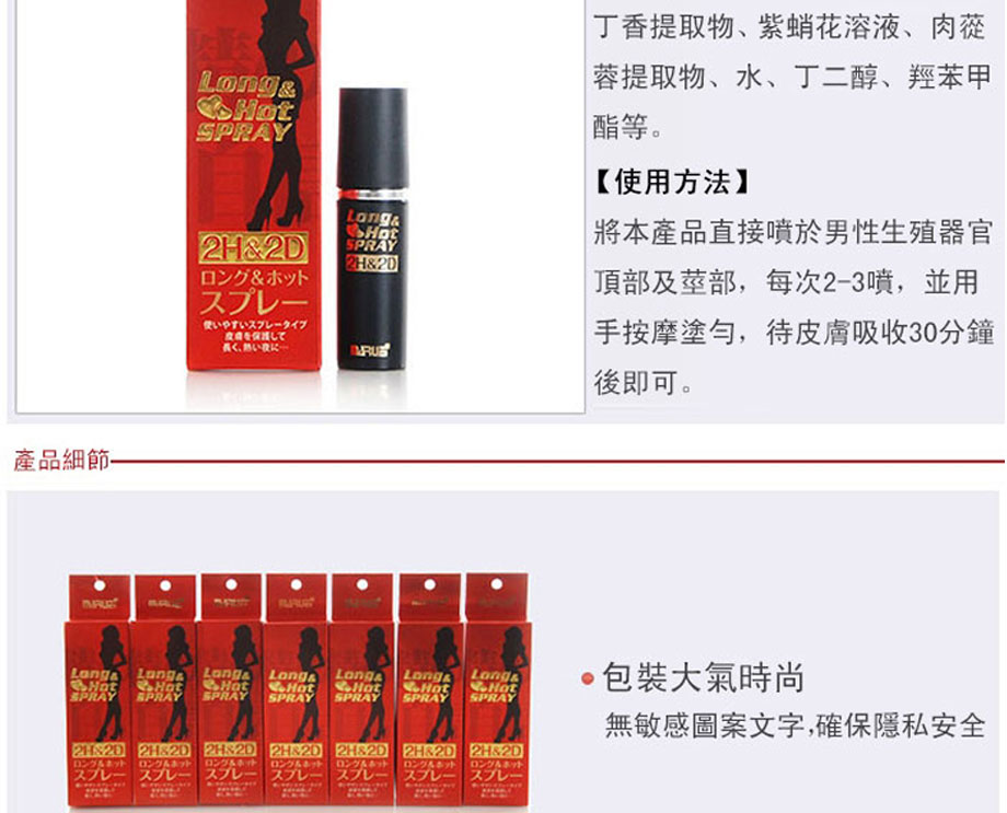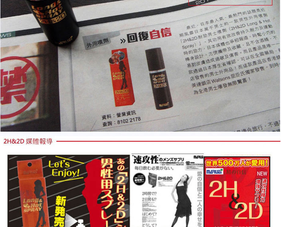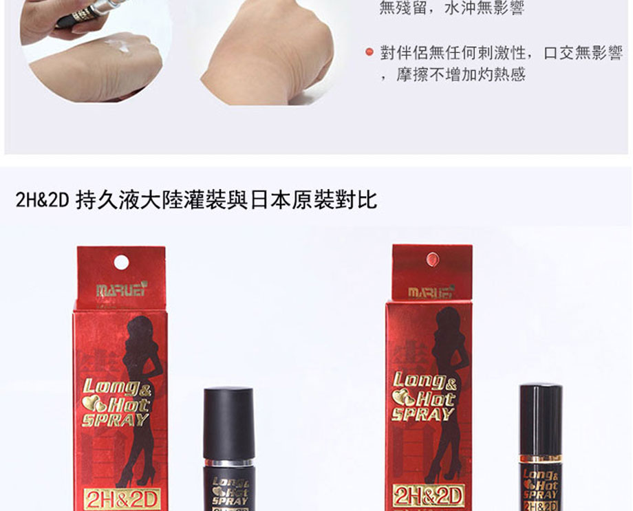 作為日本丸榮集團推出的全球首個天然外用延時產品。2H2D延時噴劑於2008年在日本上市,該品甫壹露面便震驚業界:全部采用天然草本原料,全球唯壹通過提取中藥成分,實現超長延時的外用產品。首創三角循環機理,效果相乘而非相加,最高可延時可達30分鐘以上,堪稱外用早洩產品中的“終結者”,2H2D延時噴劑已連續三年蟬聯日本延時產品銷售冠軍。
