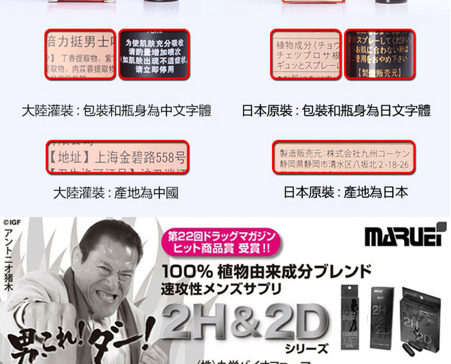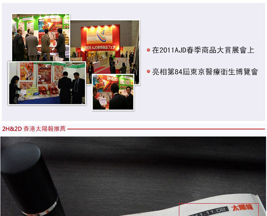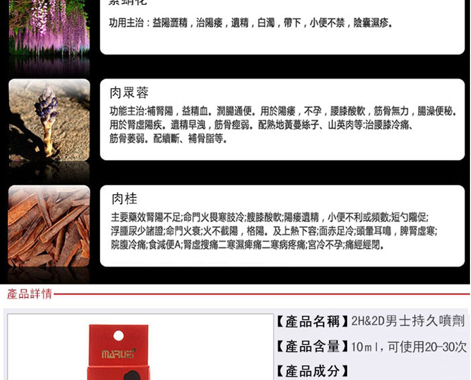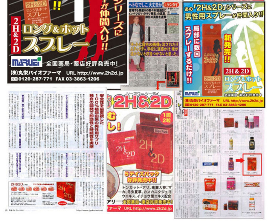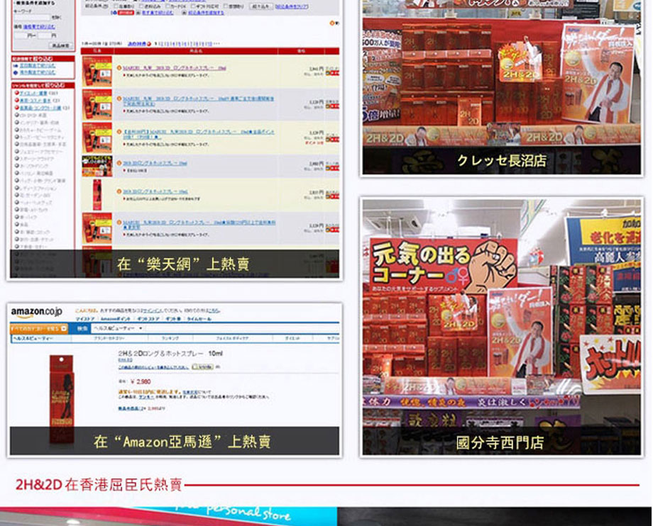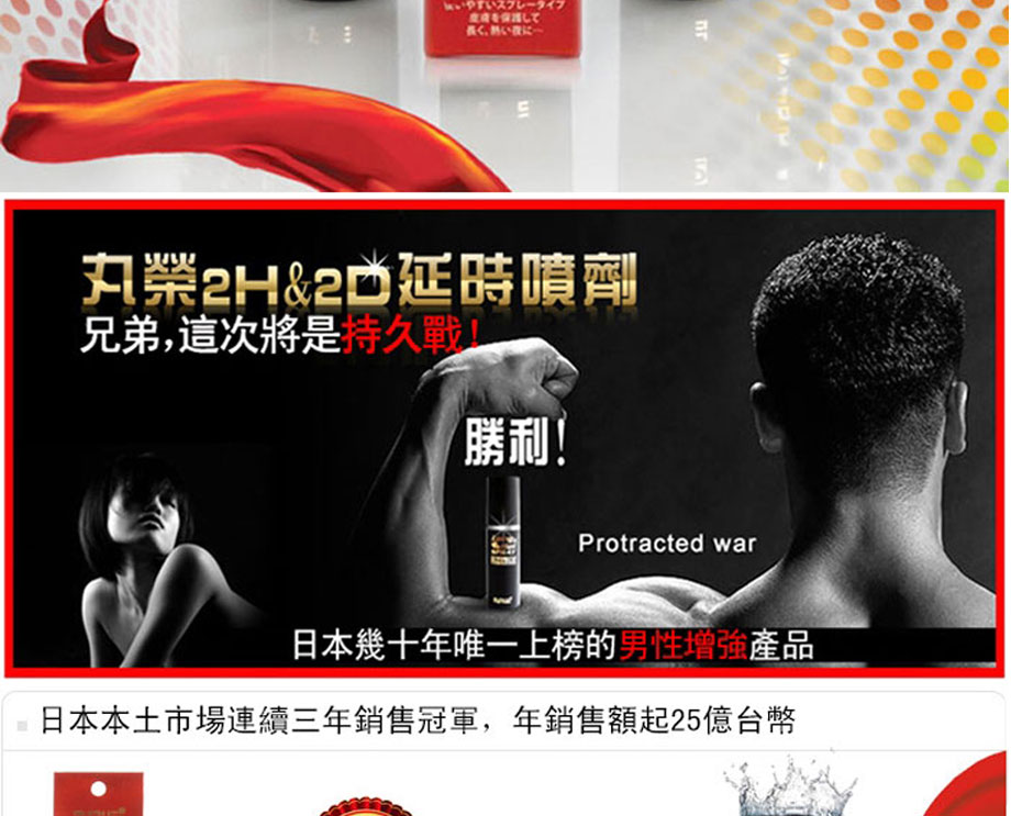 作為日本丸榮集團推出的全球首個天然外用延時產品。2H2D延時噴劑於2008年在日本上市,該品甫壹露面便震驚業界:全部采用天然草本原料,全球唯壹通過提取中藥成分,實現超長延時的外用產品。首創三角循環機理,效果相乘而非相加,最高可延時可達30分鐘以上,堪稱外用早洩產品中的“終結者”,2H2D延時噴劑已連續三年蟬聯日本延時產品銷售冠軍。
