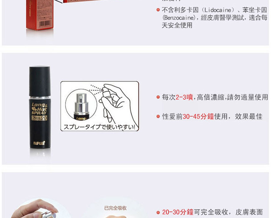 【使用方法】:取本品直接噴塗於男性龜頭冠狀溝部位(可用手指塗抹均勻盡量避免觸及尿道),每次噴1-2下手指塗勻,並輕輕按摩龜頭促進吸收,30-40分鐘後藥效可達峰值即可房事。