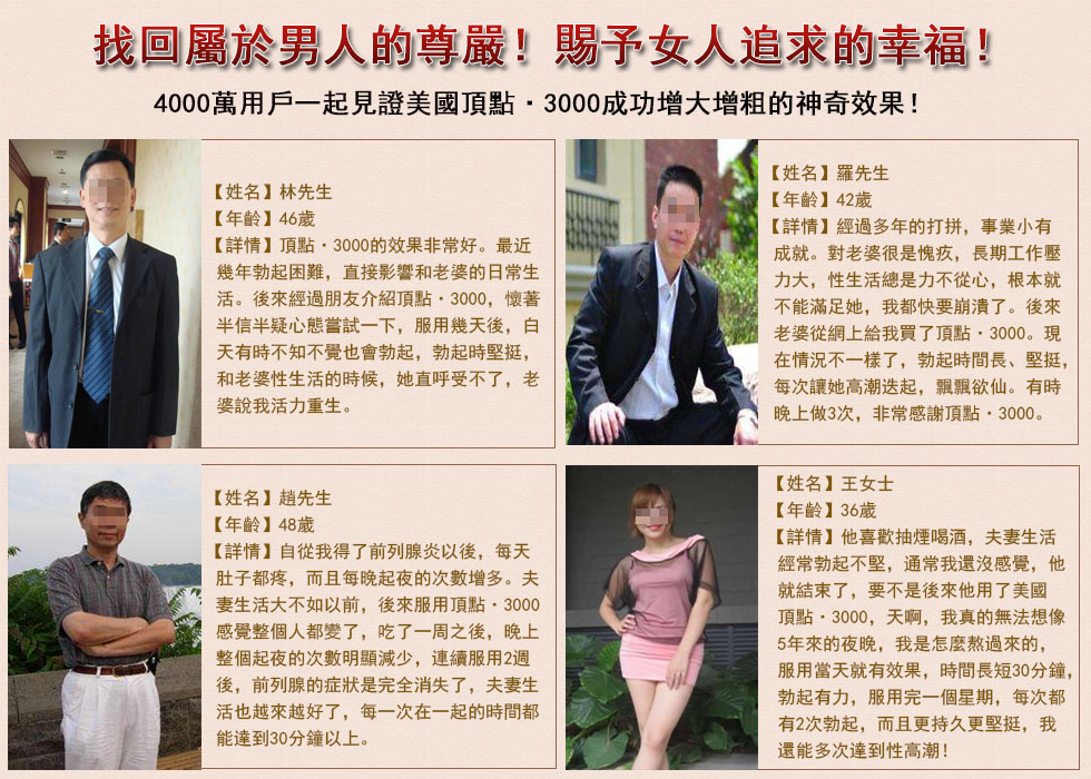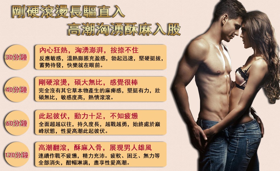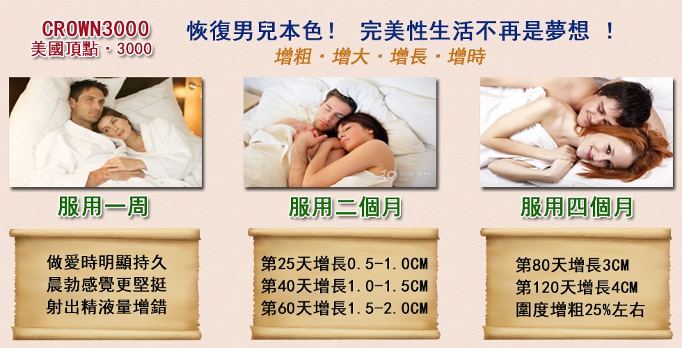 服用 CROWN3000 多能多後,射精有力,使90%以上患有陽痿早洩者做愛時間達30分鐘到1小時以上,4小時內保持精力旺盛,連服1個療程撤底擺托性障礙困擾
