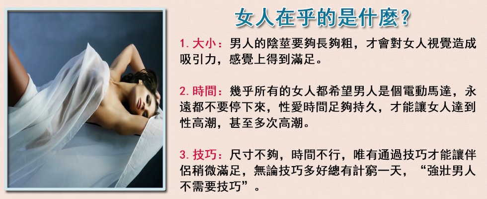 6.變換多種體位,採用各種性交動作,時快時慢時剛時柔盡情抽拉刺深。交歡時間多達到1小時以上,做愛雙方快感陣陣,高潮連連,不必擔心過早射精。