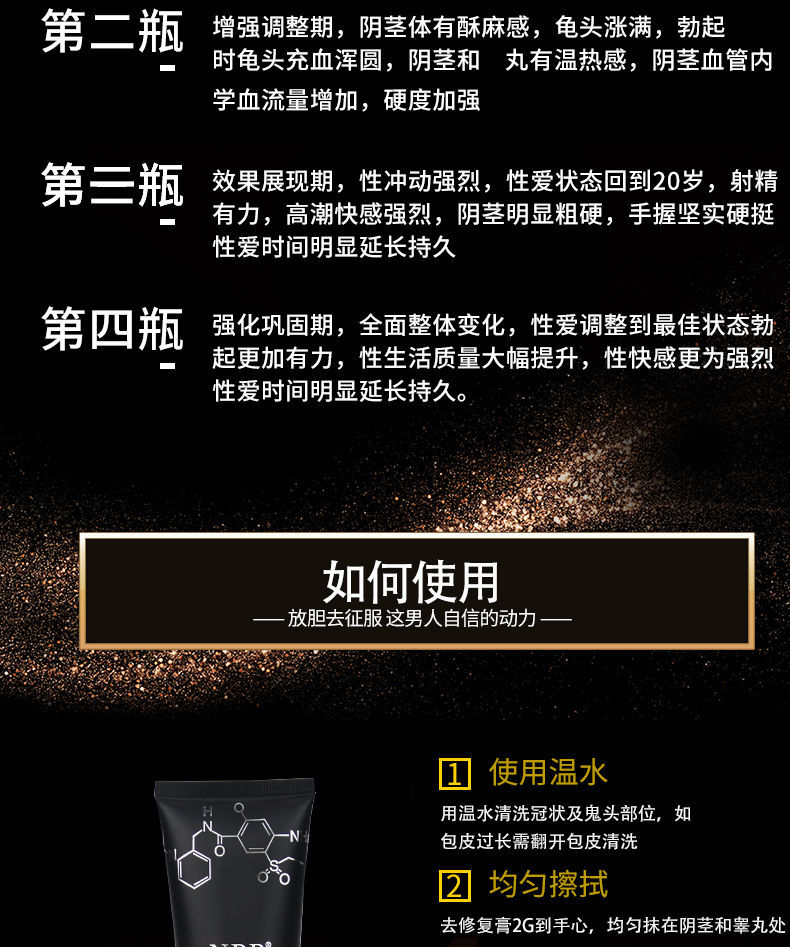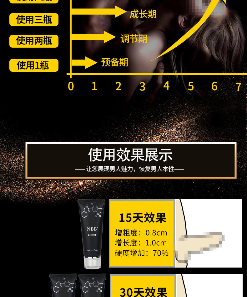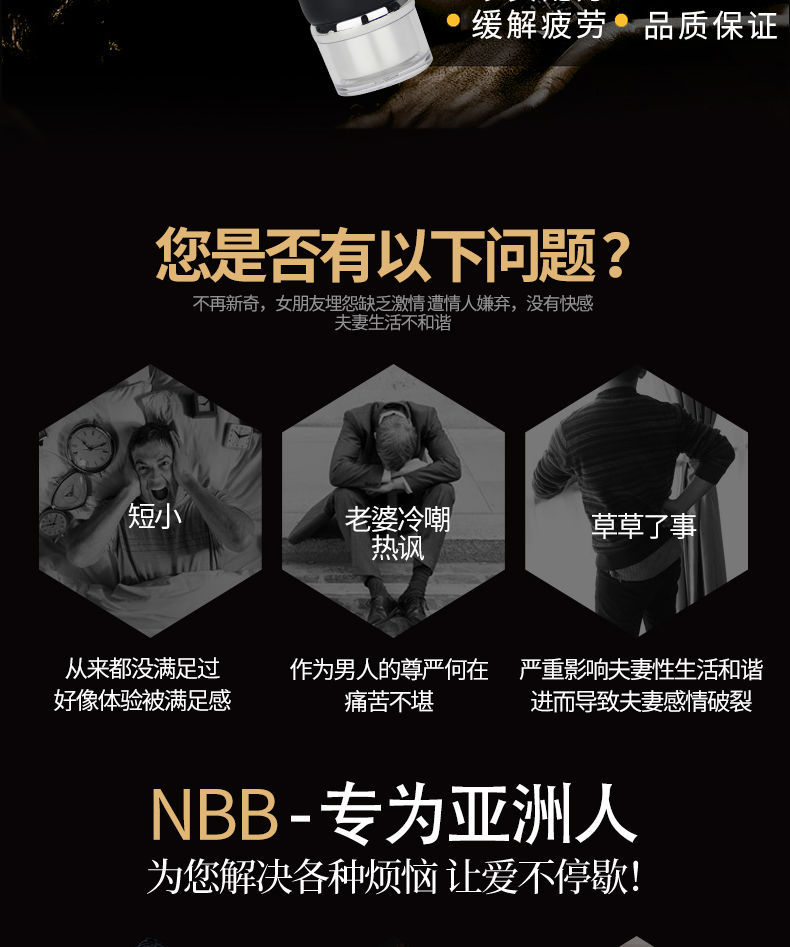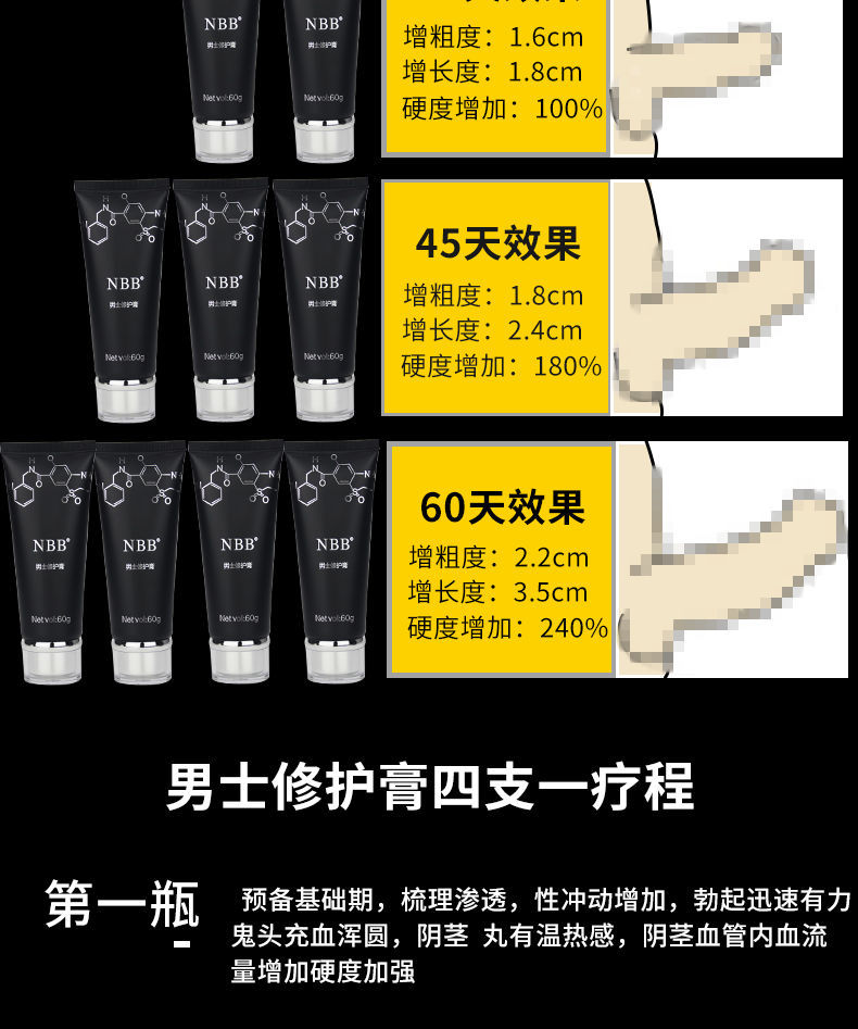 【功能效果】根據2012年3月世界衛生組織的報告——報告反映陰莖短小的男性數量在2011年持續增加,各個年齡的病人不得不尋求醫學幫助(即臨床手術)。而近年來,關於夫妻伴侶間床上表現不佳這一重大問題的報道愈加增多。因而NBB修護膏應運而生,它能通過快速吸收,修護男性生殖器幹細胞而活躍陰莖狀態,做到3秒吸收、5秒滲透,以達到增大增粗的目的,解決舉而不堅的問題。讓男性器大活好來提高生活與房事質量,提升男性性自信而滿足您的性伴侶。