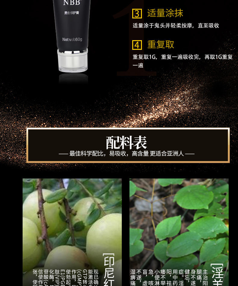 【產品介紹】NBB男士修護膏是一款新星產品,其天然藥草植物萃取與幹細胞技術都是世界頂端的,吸收作用迅速起效!因效果好且有眾多明星代言而迅速風靡東南亞,這點在大陸表現尤為突出,乳神龔玥菲為其簽約站台,可見NBB增大膏當下大熱程度。NBB男士修護增大膏4盒一療程,主打高端男性健康市場,為不少時尚商務男士解決了難言之隱。這點也是經得起驗證與實踐的。