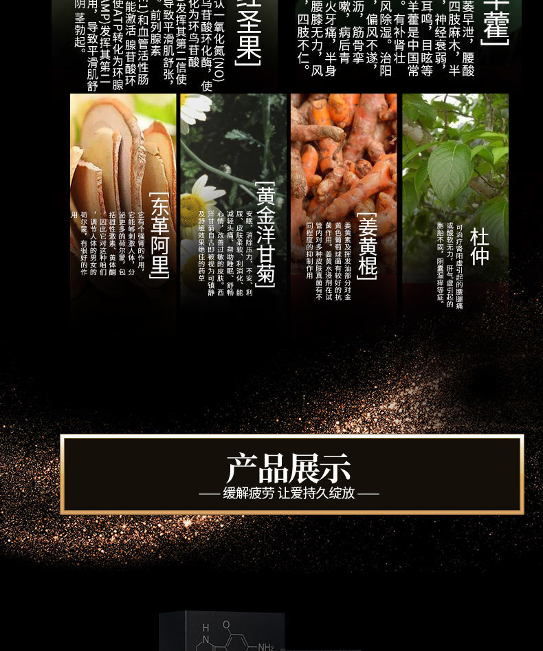 【主要成份】東革阿里提取物,印尼紅色人參,淫羊藿提取物,杜仲提取物,薑黃提取物,黃金洋甘菊等。成分均為名貴植物,且採取美國高端幹細胞技術與臨床實踐而製成。